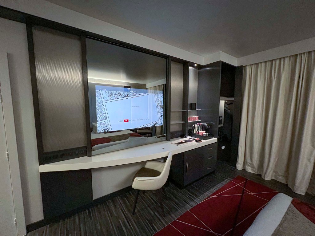 We originally booked a standard room (a.k.a. a Superior Room) and were upgraded to a terrace room with one large bed and two bunk beds (which we didn’t need but… hey why not). Our room was also accessible, which meant that the restroom was massive and had enough space for hotel guests in wheelchairs to navigate around in. The artwork was nice, we had three pieces in total. One large Ant Man inspired print by the entrance and two smaller pieces next to the bed. Our room was also an adjoining room. Those are two guest rooms, located next to each other that are connected by a locked door. We did hear noise from the neighbor’s, specifically it was television noise and it all came through that locked door element. Honestly, I don’t even think they were watching TV that loudly. However the hidden TV behind the mirror seems to project its sound backwards. There are no real openings to let the sound through to the room directly. So you have to turn it up a bit to even hear it properly in your room. Which means that the neighbors are getting a full blast which is an unfortunate design choice. A small, front facing sound slit would have solved that issue.