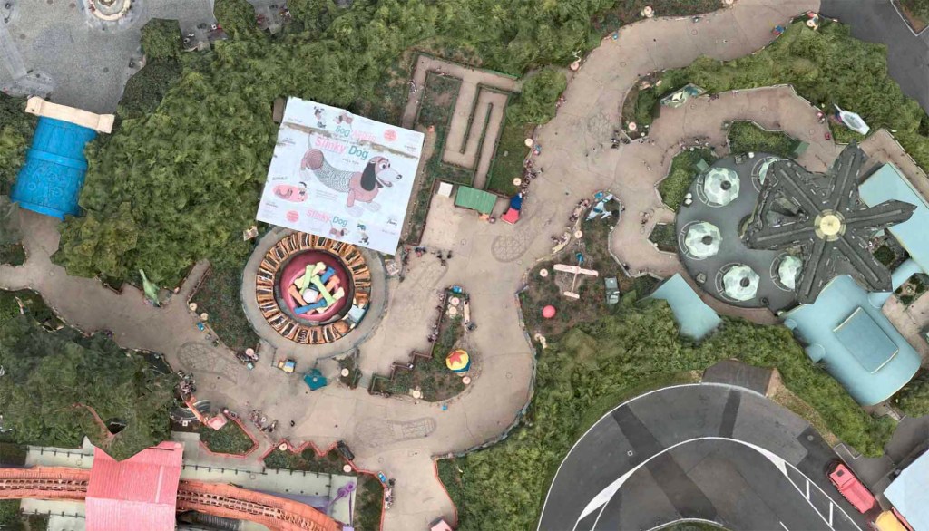 Another fun detail that is only visible from above are giant footprints along Toy Story Playlands path. It’s as if Andy just ran through the backyard and treaded on soft soil. From the decor to the landscaping, everything works together to give park goers the impression of being shrunk to the size of the Green Army Men. The entire land is set up in a way that makes it appear as if Andy has just left, after setting up his favorite toys. Imagineers also originally intended to build a spinning attraction in the land, which was eventually replaced by RC Racer during the lands development process.