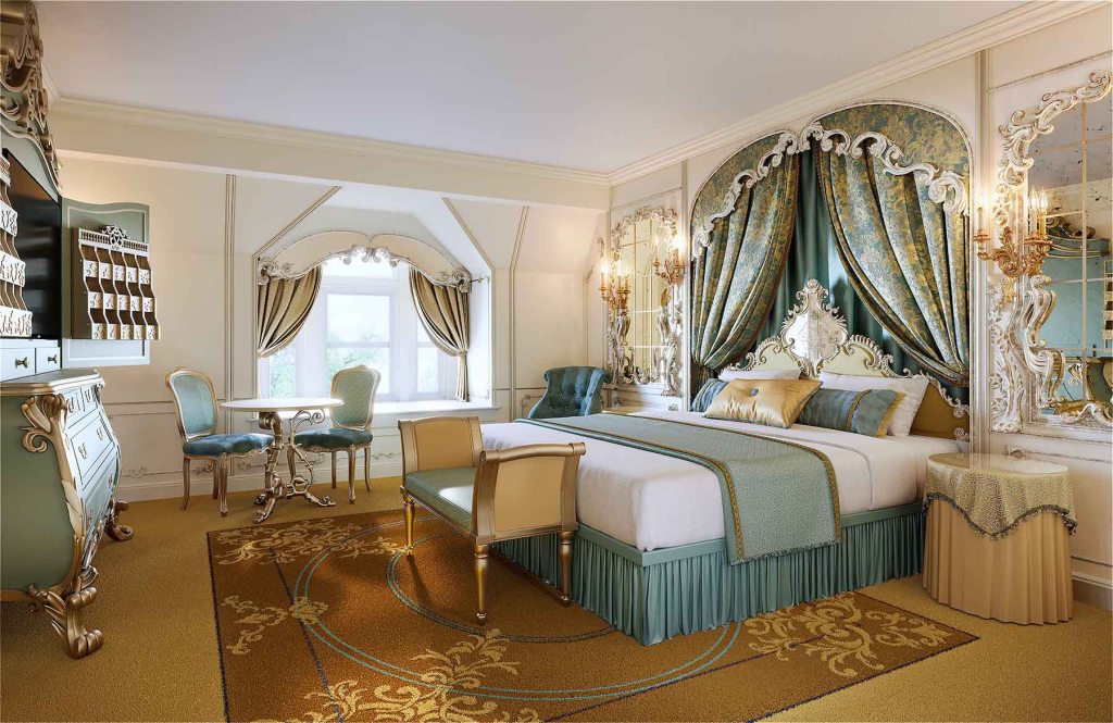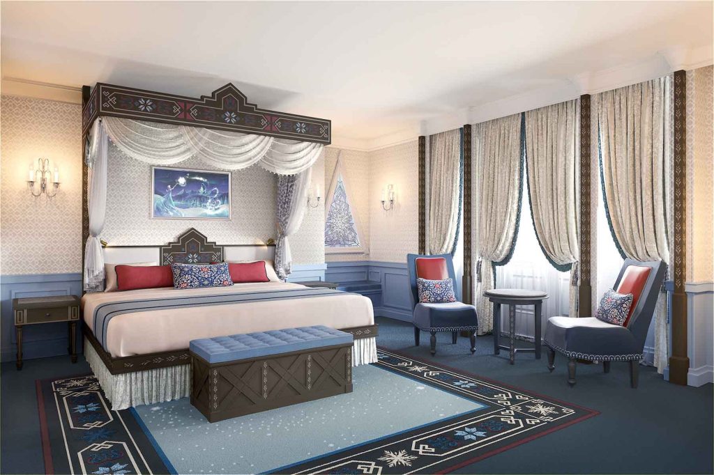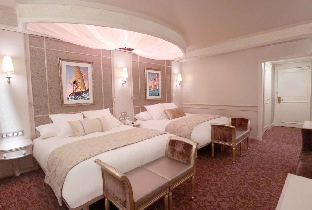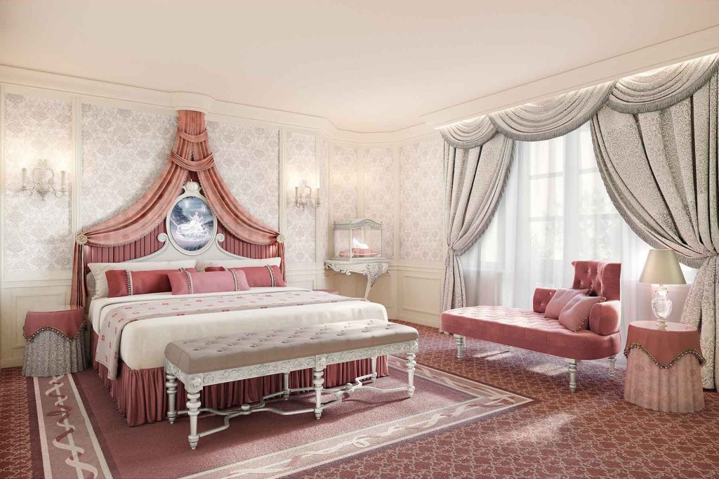 The Disneyland Hotel features a total of 487 rooms and suites, encompassing 346 Superior Rooms, 82 Deluxe Rooms, 41 Castle Club Rooms, 16 Signature Suites, one Princely Suite, and one Royal Suite. These accommodations have been redesigned to provide hotel guests with new and elegant interiors that blend the tradition of Disney storytelling with modern comfort. Throughout these spaces, hotel guests will find artwork and subtle decor accents, creating an atmosphere that pays homage to the royal Disney stories.