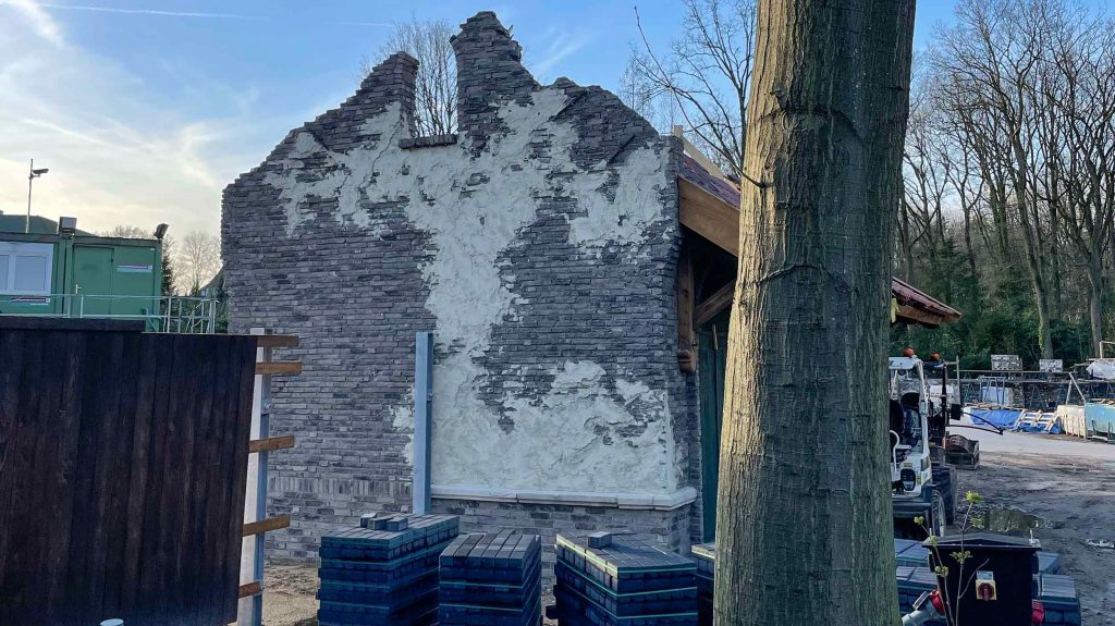The exterior of the souvenir shop, Dr. Charlatans Kwalycke Zaken, which also serves as the exit for the attraction, is not yet fully completed. The entrance still lacks certain components. At the rear, construction is ongoing for a protrusion featuring a large opening. Eventually, the wooden roof beams will take on a weathered appearance.
