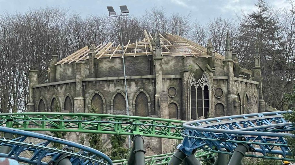 Efteling has dismantled the scaffolding encircling its latest attraction, Danse Macabre, unveiling the entirety of its structure for the first time: a 20-meter-high weathered abbey comprised of various levels, giving the impression of age with its broken support beams, crumbling towers, and abundant green overgrowth.