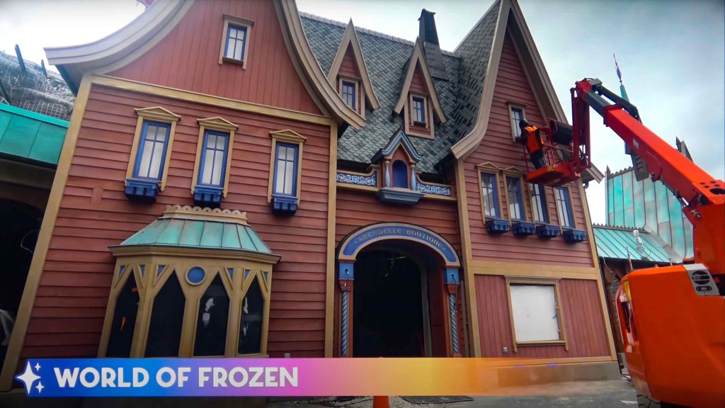 Disneyland Paris is currently making good progress on construction in the upcoming “World of Frozen” land. Various town facades are nearing completion.