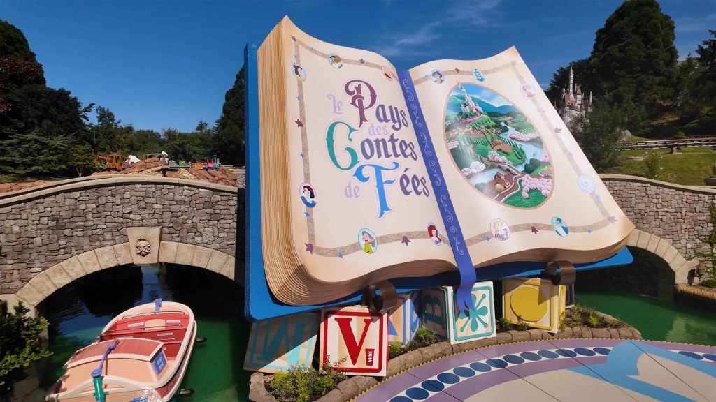 Le Pays des Contes de Fées, which translates to The Land of Fairy Tales, also received a new entrance. This ornate blue arch features pages from fairy tale books and a mention of the attraction’s new sponsor, Vittel, known for its bottled spring water.