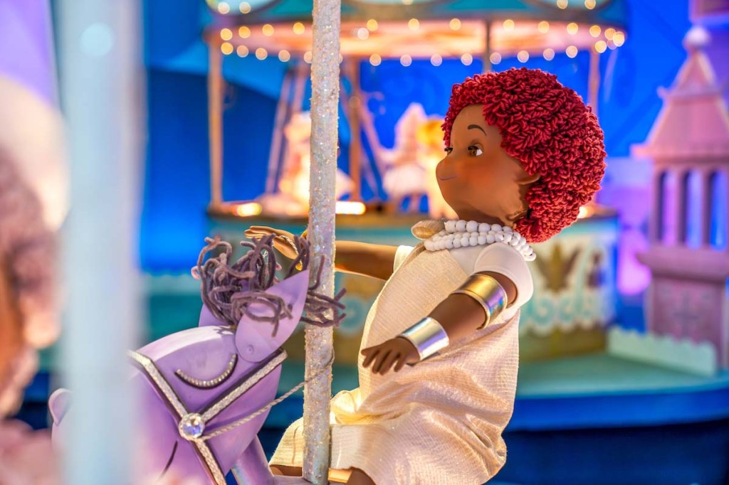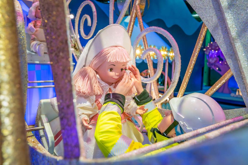 The project particularly focused on refreshing the attraction’s finale scene, where figures representing children from various nations gather in gold, pastel, and white attire.