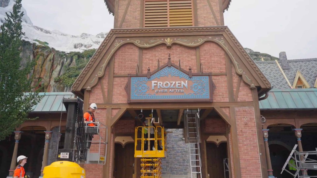 Disney Imagineers recently completed installation of Elsa’s ice palace atop North Mountain, constructed from more than 30 individual pieces.
