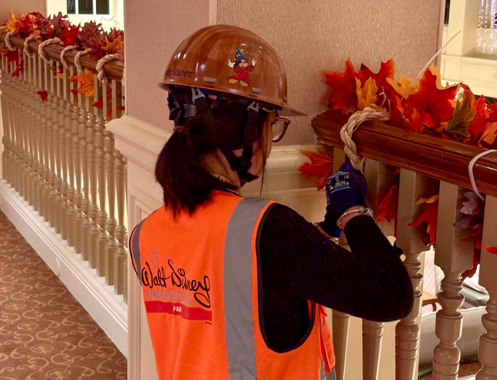 The themed enhancements were developed through a collaboration between Walt Disney Imagineering and Hotel Product Resort teams. Arriving guests will encounter autumn-themed decorations beginning at the hotel car park, where the entrance porch features garlands of red and orange leaves and flower-topped pumpkins arranged around the fountain.